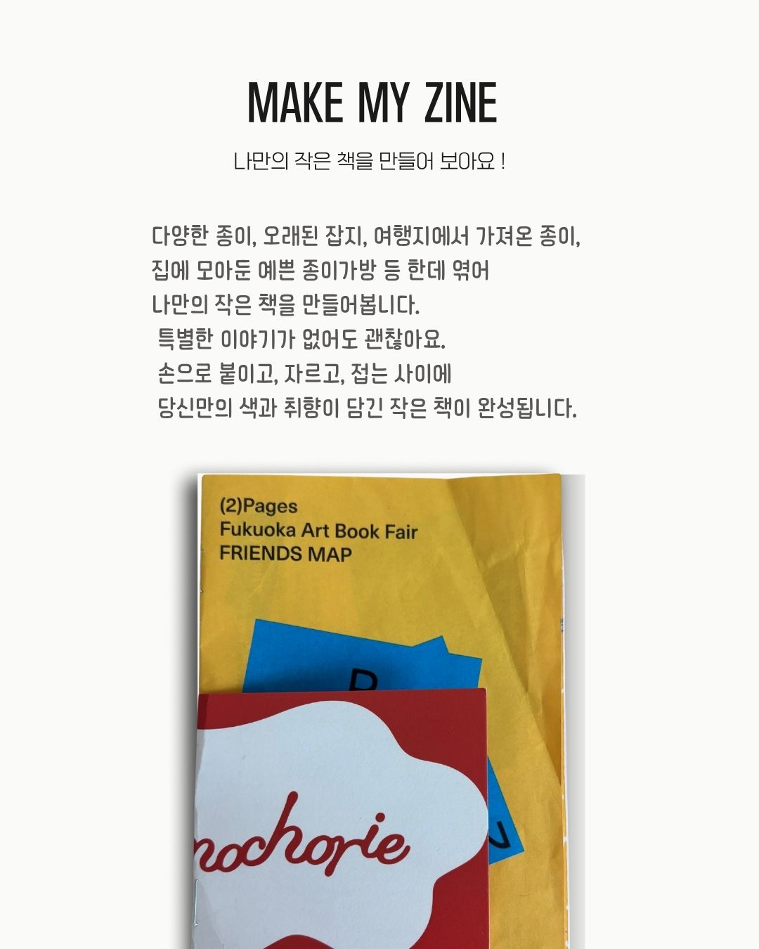 밤산책방(Night Work Book Shop) 은 부산 광안리에 자리한 24시간 무인 서점이자 창작 공간입니다. 책을 통해 감정을 기록하고 나누는 다양한 프로젝트를 이어오고 있으며, 이번 프로그램에서는 누구나 자신만의 이야기를 담은 작은 책(zine)을 직접 제작해보는 체험을 마련합니다.